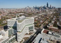 Rush University Medical Center, which is among the world’s largest LEED Gold-certified hospitals, is notable for its sustainable features. Designed by Perkins+Will, the hospital incorporates green roofs, rooftop gardens, and a rainwater harvesting system, along with waste-reducing and energy-saving technologies.