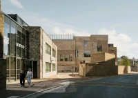 Designed to bring a new sense of rhythm and energy to its central location, the building’s façade’s proportions and scale are designed to be in harmony with the surroundings. The height of the ground-floor retail store facades on the east and west sides matches the neighboring buildings, with inspiration taken from the proportions of nearby heritage structures like the Prudential Assurance Building. Built on the site of a 1980s office block, the new building repurposes or recycles 97% of the waste generated by the demolition of the old building. The structure, which generates renewable energy with photovoltaic cells at the roof level, uses a blue roof system and attenuation tanks to capture rainwater, saving the public system from the risk of over-flooding.