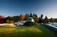VanDusen Botanical Garden Visitor Centre in Canada is an iconic example of sustainable architecture that seamlessly integrates with nature. Located in the southeast corner of the garden, the visitor center is a dynamic, single-story structure designed like undulating flower petals inspired by organic forms and natural systems. The structure, which consists of curved compressed soil and concrete walls, has a prefabricated innovative wavy-shaped roof with a skylight (oculus). Vandusen Botanical Garden Visitor Center, which includes a café, library, volunteer service areas, garden shop, offices, multi-purpose classrooms and rentable spaces, has solid walls that protect visitors from the busy street, while its transparent walls open the building to the garden.