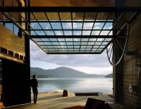 In order to protect the corridor overlooking the lake from neighbors, the Northwest Art House was positioned perpendicular to the water. Almost appearing to float on the water, the perpendicular orientation of this home allows for a cabin building with showers and an outdoor room with an orchid greenhouse, outdoor cooking area and pizza oven, where both food and flowering plants enliven the landscape.