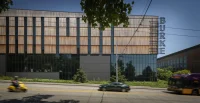 Movement and materiality are especially evident in the first four floors, where seven custom 8-foot diameter steel wheels regulate daylight by opening and closing 35-foot-high exterior panels. With a facade that moves like fabric, the building’s position and proportions shift, emphasizing the visual interaction between the structure and the city at large.