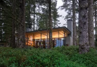 Designed by Olson Kunding Architects, the Tofino Beach House is a unique coastal home situated within a weathered forest. Consisting of one large room, the oceanfront facade of the house is flooded with light, while the other facades are isolated and sheltered, thus connecting the Beach House to the drama of the ocean and the sacredness provided by the trees.
