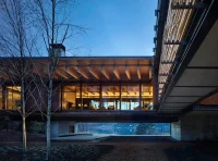 These shutters, which can be opened or closed with simple gear and key controls, allow the facade to transition from fully glazed to partially open or completely enclosed with weathered steel. The bridge between the two wings not only provides privacy but also creates a pathway lined with evergreen trees. To preserve the trees, the house is spread across the site, optimizing the views and blending seamlessly with the natural surroundings.