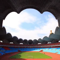 Its roof, designed to resemble a magnolia blossom, is formed by 16 arches and has a unique design that won first place at the 1988 Geneva International Exhibition of Inventions. The roof covers an area of 94,000 m² and is supported by 11,000 steel outer panels. Sixteen petal-shaped segments extend 60 meters inside the stadium and 40 meters outward. Inside, Rungrado 1st May Stadium, which houses training areas, dressing rooms, and various halls for performances and events, has a traditional grandstand design consisting of two large rings. The stadium’s bowl-like structure ensures excellent views for all spectators, enhancing their overall experience.