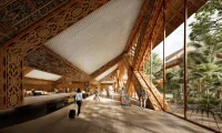 Harmoniously blending into the surrounding natural terrain, the arrival plaza is designed as a series of four zones each dedicated to specific plants found within the forests in Gelephu. A gathering space features paving made from local natural stone and integrated seating areas, while abundant greenery and a canopy provide protection from the elements.