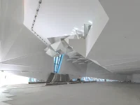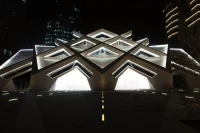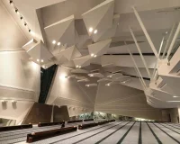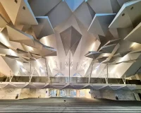 The integrated structural and mechanical skin of the building envelope ensures an uninterrupted interior surface which was further complemented by suspended geometric ceiling panels that reflect the multifaceted exterior form. These ceiling panels that serve as an abstraction of traditional muqarnas that are decoration corbels also improved the acoustic and lighting performance.