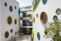 The circular windows framed with primary colors placed in different sizes and heights according to the needs of different age groups create an attractive space for children on a white backdrop. Indoor and outdoor play areas, a sports center, and a swimming pool support children’s physical development, while art classes, music rooms, kitchens, and libraries nurture creativity. Playful fluid shapes and dinosaur-like ribbed surfaces on the classroom ceilings add to the fun.