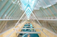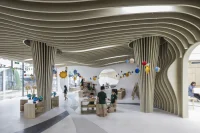 Inspired by the fairytale country drawn by his daughter, architect Wutopia designed Lolly, China’s first educational family restaurant. The restaurant’s exterior is covered in overlapping aluminum panels with various-sized holes, creating undulating waves. These panels, which surround the various entrance points of the building, create a world between reality and dreams for children. The front lobby is a circular space that offers a forest experience with thick layers of leaves made of 1000 suspended acrylic tubes in a ring formation.