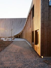 Čoarvemátta is located in Kautokeino in the middle of Finnmarksvidda, Norway’s largest and northernmost plateau. All the building’s sides and facades are equally important, and relate to the various landscape spaces that surround it in different ways. The two-storey building is low in the landscape and has proportions that harmonize with hills and elevations in the surroundings, avoiding angles breaking with the landscape’s natural shapes. The roof slopes on both sides of the building (north, south) to minimize the height effect of the project seen from a distance, and forms at the same time an entry situation towards the access from southwest.