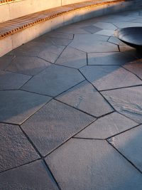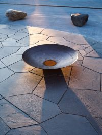 The shape of the building naturally forms three outdoor spaces. The one facing south constitutes the main entrance and a space in front of it. The forecourt is an intimate and circular space with arrán, a fire pit, sitting stones and an amphitheatre. The sitting stones are taken from the plateau just outside, and this flexible room can be used by both school and theatre. The Alta slate used here comes from a quarry near the construction site.