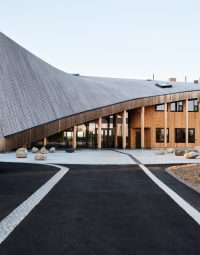 The shape of the building springs from the idea of creating a unified volume for the theatre and the school, and of gathering the functions around a connection point – the meeting place. Elements have also been taken from Sami building traditions – the skylight in the vestibule, the visible supporting structure, and the unifying roof with its soft shape that opens towards the entrance.