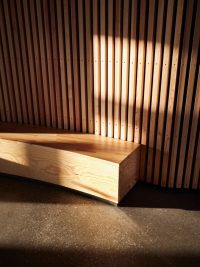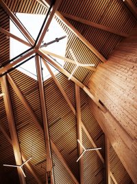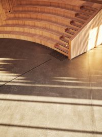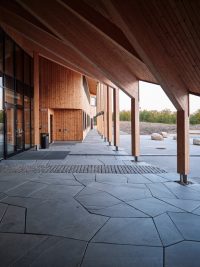 The vestibule is the focal point of the building. The curved lines, the highlight of the roof with skylights like from a reahpen, smoke hole, and the visible load-bearing glulam wooden structure, are inspired by light wooden constructions typical of reindeer-herding Sami areas, such as the lavvu.