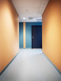 The approach to colors and material concept for the school is holistic. The center of the building, around the foyer, vestibule and theater halls, is painted in warm, red shades. Then the color scheme becomes cooler, and the further away from the hearth you get, the colder the colors become, with bluish tones at each end of the building’s wings. Contrasts between door, wall and floor within the different heating zones have clear references to Sami use of color. This makes a strong contrast to the building’s exterior, which is clad in white for the most part of the year.