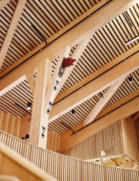 The façade of the building is made with standing wood cladding in ore pine. The massive roof measures 4930 m2 and is clad with 34,000 meters of kebony. The Alta slate on the theatre’s gable wall has been reused from the village’s old primary school, which has been demolished.