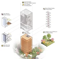 The all-electric, fossil fuel-free design features a monolithic massing to minimize material use and energy loss. Its mass timber structural frame reduces embodied carbon by 87% compared to an initial steel-and-concrete option. The entire building envelope is triple-glazed with integral solar screening to reduce solar heat gain while maximizing natural light in interior spaces.