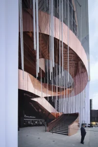A striking feature of the Pavilion is its shifting facade, composed of 17-meter-high fabric veils resembling theatre curtains. These curtains dynamically respond to light and wind, creating a continually evolving visual spectacle. Visitors move through a looping pathway that blends enclosed exhibition areas with open-air spaces, culminating in a serene inner garden that underscores nature’s crucial role in human connection.