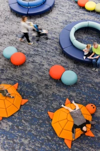 The open layout incorporates a colourful and playful children’s area with comfortable seating and interactive elements, adult areas comprised of nooks for reading, standing stacks, and individual study facilities. The informal areas for meetings, exhibitions, and workshops foster collaboration and social interaction, while formal, organised spaces provide guidance and service. The functional and inviting spaces integrate technology with easy access to wifi, computer access throughout the library, and modern audiovisual technology.