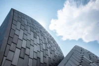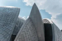The architects emphasize the enclosure of overlapping, intersecting, and entangled domes by tracing the contours of the domes with stainless steel profiles. The facade of the mosque is adorned with a stainless steel substructure supporting the porous matt finish stainless steel mantles enriched with high-strength titanium creating an interplay of reflections and adding depth.