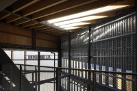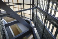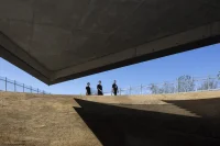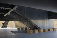 Sustainability also informs the Pavilion’s materials and finishes. Innovative reuse of temporary construction materials as primary finishes reduces both economic and ecological impacts. Polycarbonate panels and steel scaffolding form the Pavilion’s exterior, while elements such as sandbags, steel pipes, tread plates, and lighting fixtures have all been carefully selected for their potential reuse after the Expo concludes. Interior finishes thoughtfully incorporate practical materials like blue tarps, laminated timber, oriented strand board (OSB), and chain mesh fencing.
