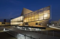 Inside, the Pavilion invites visitors on a carefully choreographed journey through immersive experiences spread across its multi-dimensional spaces. Guests first enter the semi-subterranean Waiting Park, designed to provide a shaded, comfortable refuge from direct sunlight. From this cool, tranquil setting, visitors ascend to the first-level Pre-Show for an orientation video before reaching the second level for the Main Show, a fully immersive visual experience. The journey concludes as visitors descend back to the first floor for the Post-Show experience, culminating at the uniquely suspended Sankaku Park, or “Triangle Park,” which feels as if it hovers in mid-air.