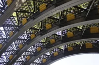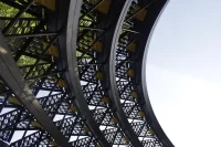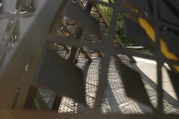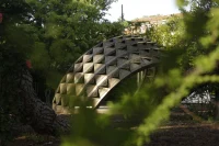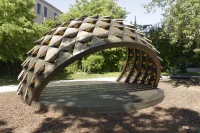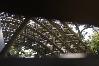 Inspired by heliodon devices traditionally used to study solar angles, SOMBRA is designed as a dynamic installation that reacts physically to sunlight. Its very name “SOMBRA” is derived from the Latin words sol (sun) and umbra (shade), capturing the pavilion’s dual identity as both a sun catcher and a shading device. The structure’s six ribbed arches, made from repurposed metal beams, correspond to the angles of the sun during the summer and winter solstices, forming a sculptural spine that anchors its unique functionality.