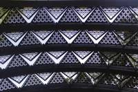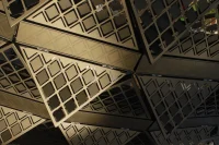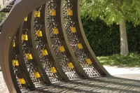 Each rib supports a series of triangular, perforated panels made with Metadecor’s MD Formatura screens. These panels are not just decorative; they open and close in real time in response to sunlight. In their natural resting state, the panels remain open, allowing filtered views through the structure. But when exposed to direct sunlight, they slowly close, providing cool shade to those below. The effect mimics a living, breathing organism, one that adjusts its form as the sun traverses the sky.