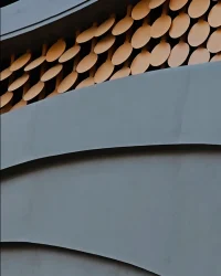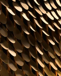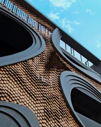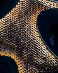 Each rose-gold sequin is strategically positioned, ensuring a seamless flow across the surface—one that is both mathematically precise and visually organic. As light shifts and perspectives change, the structured design of the sequins generates an optical dynamism, making the building appear like it is in motion. The result is a living, breathing skin that blurs the boundaries between structure and art, creating an architectural experience that is as dynamic as it is precise.