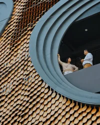 Complementing the seamless flow of MetaSequin in the facade are accentuated apertures of MetaFin, a parametric system of curvilinear metal panels that enhance the facade’s sense of movement. These flowing forms contribute to the overall fluidity of the structure, reinforcing the conceptual continuity of the design and giving the feeling of balconies as open portals.