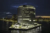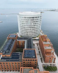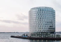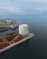 At the tip is a spectacular circular office building – a landmark for the Port of Copenhagen that references the surrounding transformed silos and industrial heritage. The building’s simple form of the circle is equal to everyone, whether indoors or outdoors. This unambiguous, archetypal form – the rotunda – appears as a clear and recognizable landmark in the harbor area.