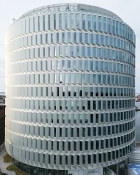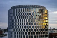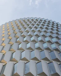 Characterized by an iconic round shape, the building enters into a symbiotic relationship with the elements, as prefabricated facade modules angle to filter daylight, the atrium works as a giant greenhouse, and water is filtered and circulated locally. The functional design is based on an annual, hour-by-hour weather simulation to strategically position the faceted elements in a way that reduces the direct influx of sunlight.