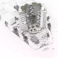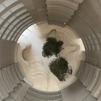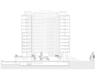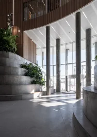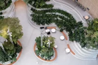 Inside is a circular verdant public garden with tall trees – an interior green space where a generous diameter ensures plenty of natural daylight.