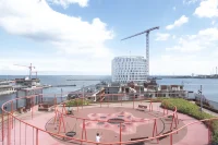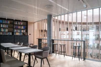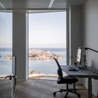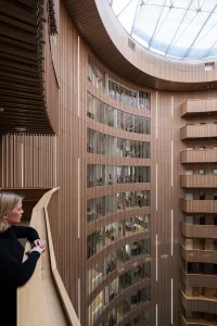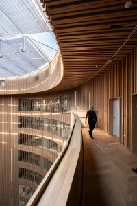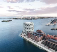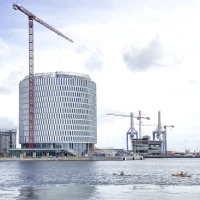 The distinct facade is simple and well-proportioned, with textural and tactile surfaces with warm and welcoming expressions. Its large scale is set to match the scale of the harbor space. It is clad in glass that reflects the water, which contributes to excellent daylight conditions and great views and lowers the level of energy consumption needed for cooling.