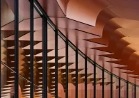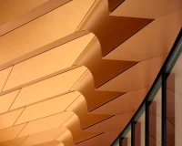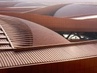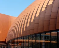 The center’s fluid architectural language and pleated, deep copper-colored façade incorporating large, recessed windows have been designed to balance the CIECC’s immense industrial scale and materiality.